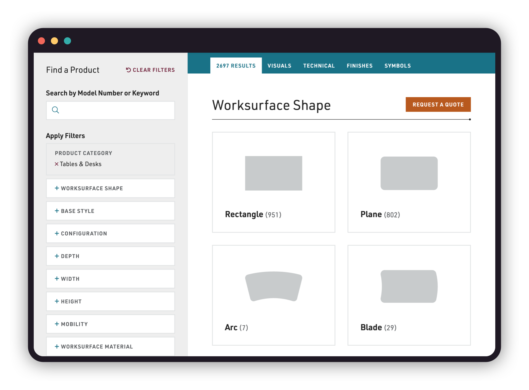 The more complex search experience is filtering by product attributes until a model number can be determined. To cater to different types of users, we designed the search system to include a visual search as well as a condensed list of filters. This allows users to both search by pre-defined filters as well as browse visually until they find the product that matches their imagination. Because products look similar within product families, we continue to display visual filters until a reasonable number of search results is found. At this time, visual filters are replaced by product teasers with links to view the full product and information.