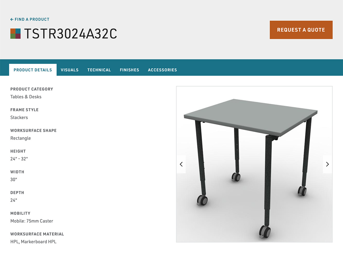 We designed a custom theme within the Drupal CMS, and we built a custom search experience within the website. To establish the company as experts in classroom furniture, the website featured research that the company had conducted which impacted the design of their products. Classroom configuration ideas by grade level and subject were also displayed to help current and potential customers decide how to furnish classrooms for the highest impact. The search system would cater to different types of user search behaviors by offering not only a model number seach, but also a visual filtered search that adapts to previously-selected options.